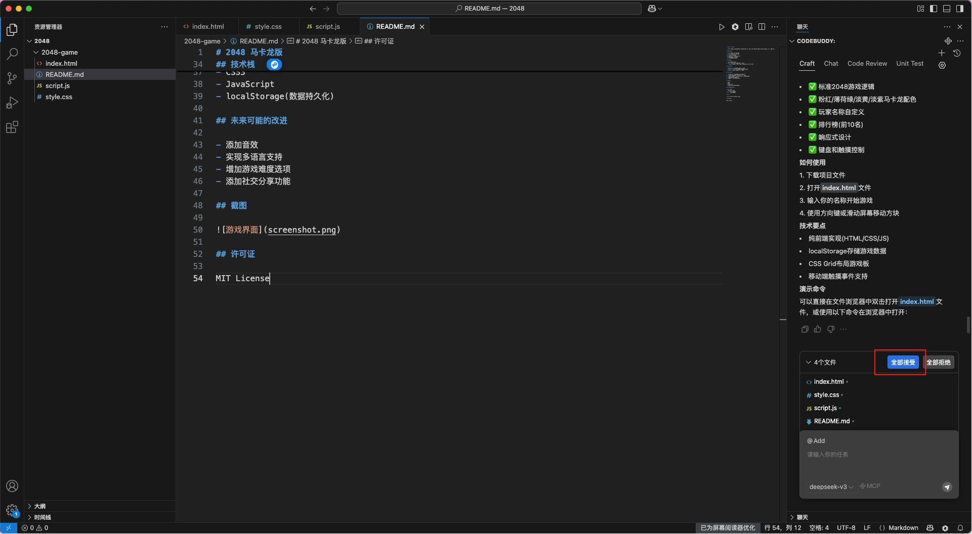 很快,稍等一会就生成好了,这个时候我们就可以点这个“全部接受”按钮啦,CodeBuddy 还特别贴心的把“如何运行”“如何使用”“技术要点”全部生成啦!