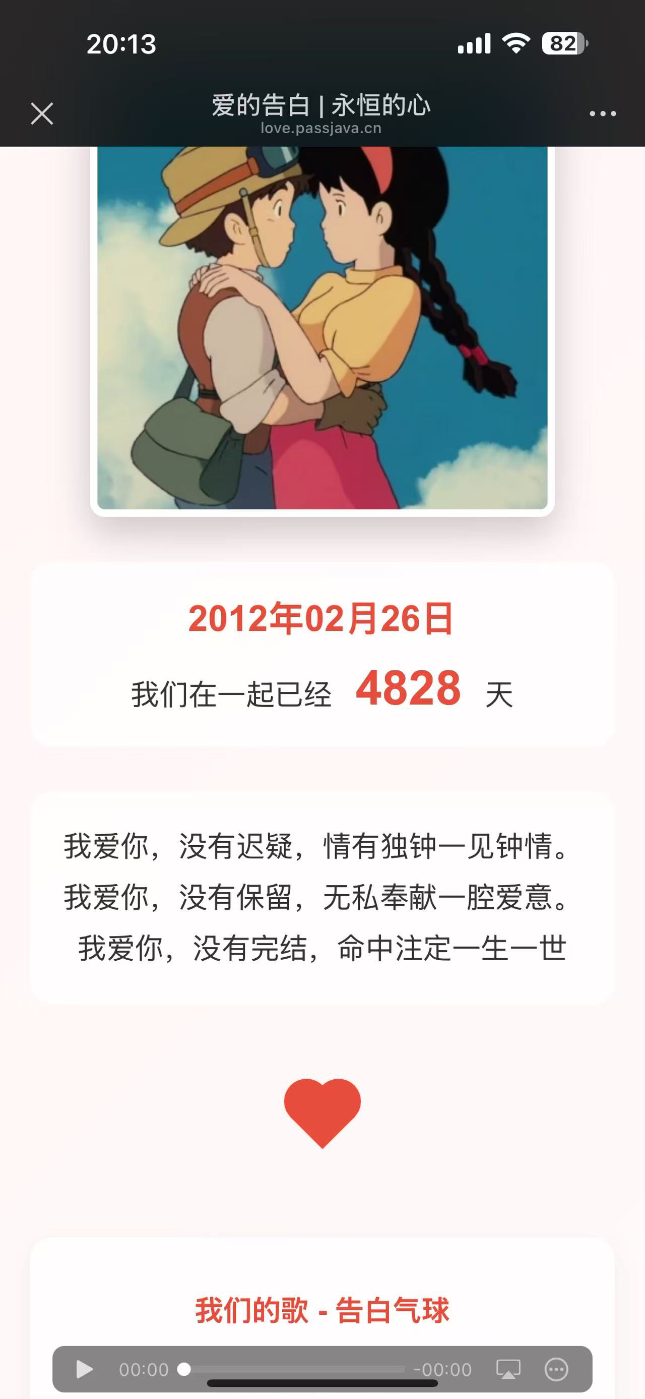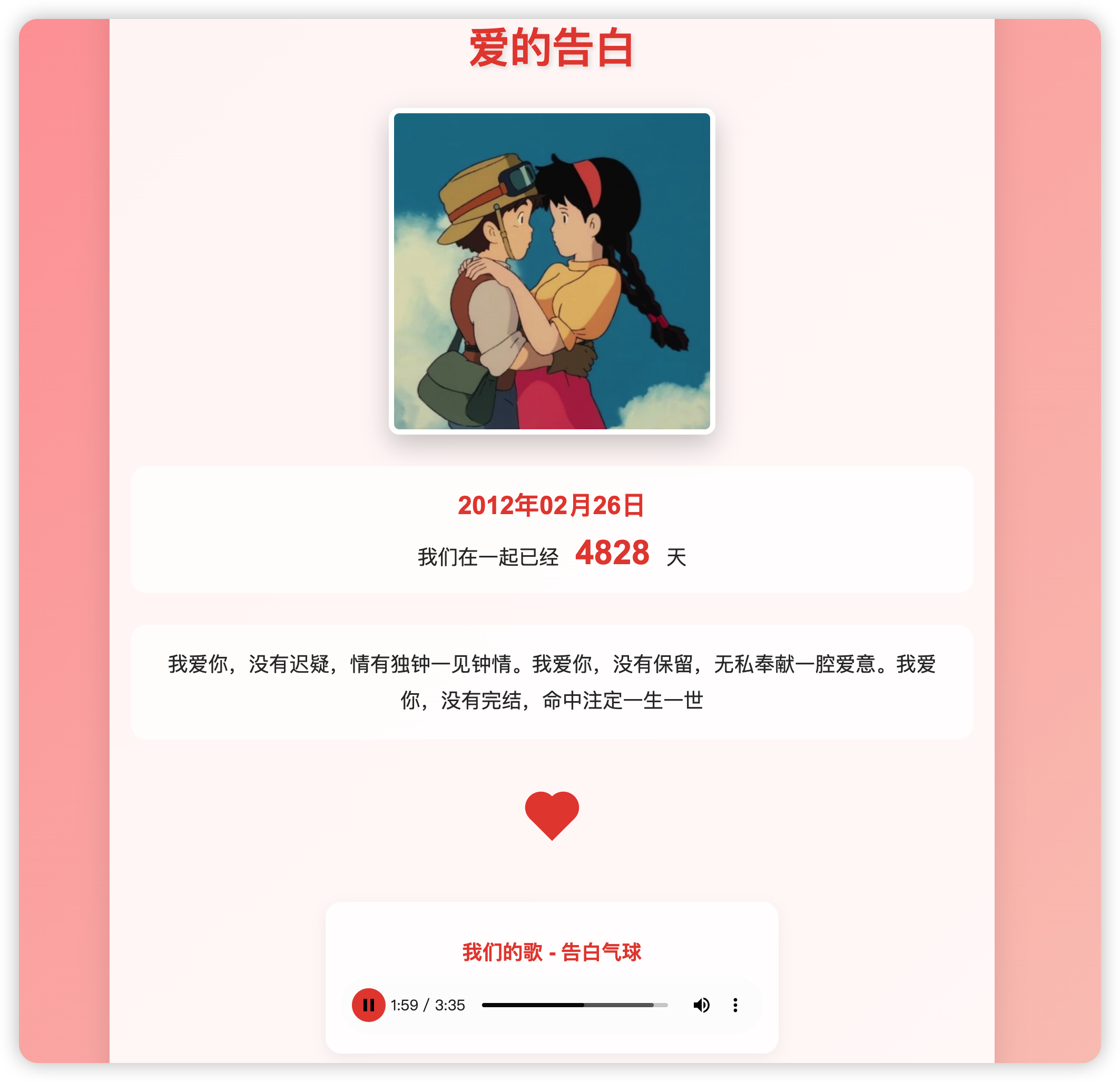 用代码实现一个爱心表白墙,要很有创意,还需要包含我和心爱之人的合照,并显示一个纪念日,加上背景音乐。