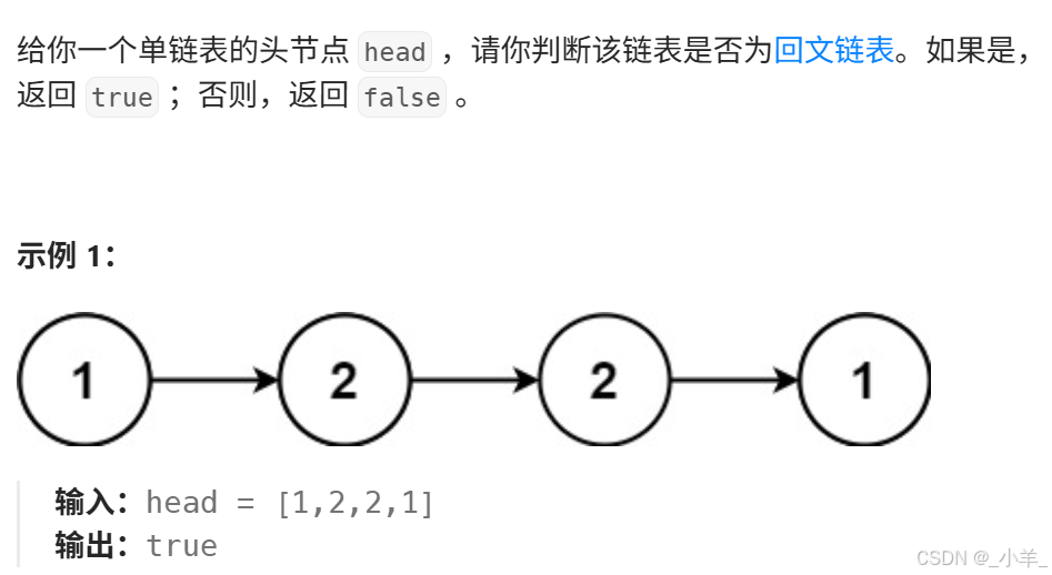 首先用快慢指针找到中间节点,反转后半部分链表,然后逐个遍历比较两个链表是否所有值都相等。 需要注意的是,如果原链表节点个数为奇数,则后本部分会比前半部分多一个节点,因此我们最后需要判断的是遍历后半部分链表的指针最后是否为空。