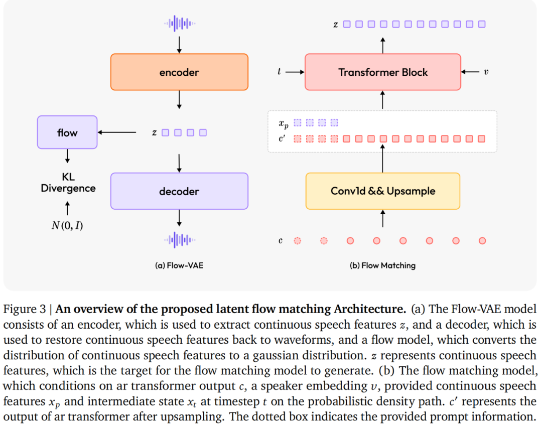 MiniMax 还提出了用于生成连续语音特征的关键组件,即基于 Flow-VAE 架构的流匹配模型。从而进一步提升了音频质量,使得生成的音频更加接近真人。