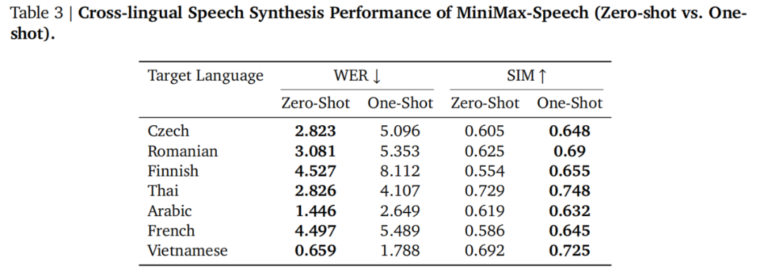 在跨语言方面,下表多语言测试结果展示了零样本语音克隆下更低的 WER,证明 Speech-02 引入的 speaker 编码器架构的优越性,可以做到「一个语音音色」支持其他更多目标语言并且理解起来也较容易。