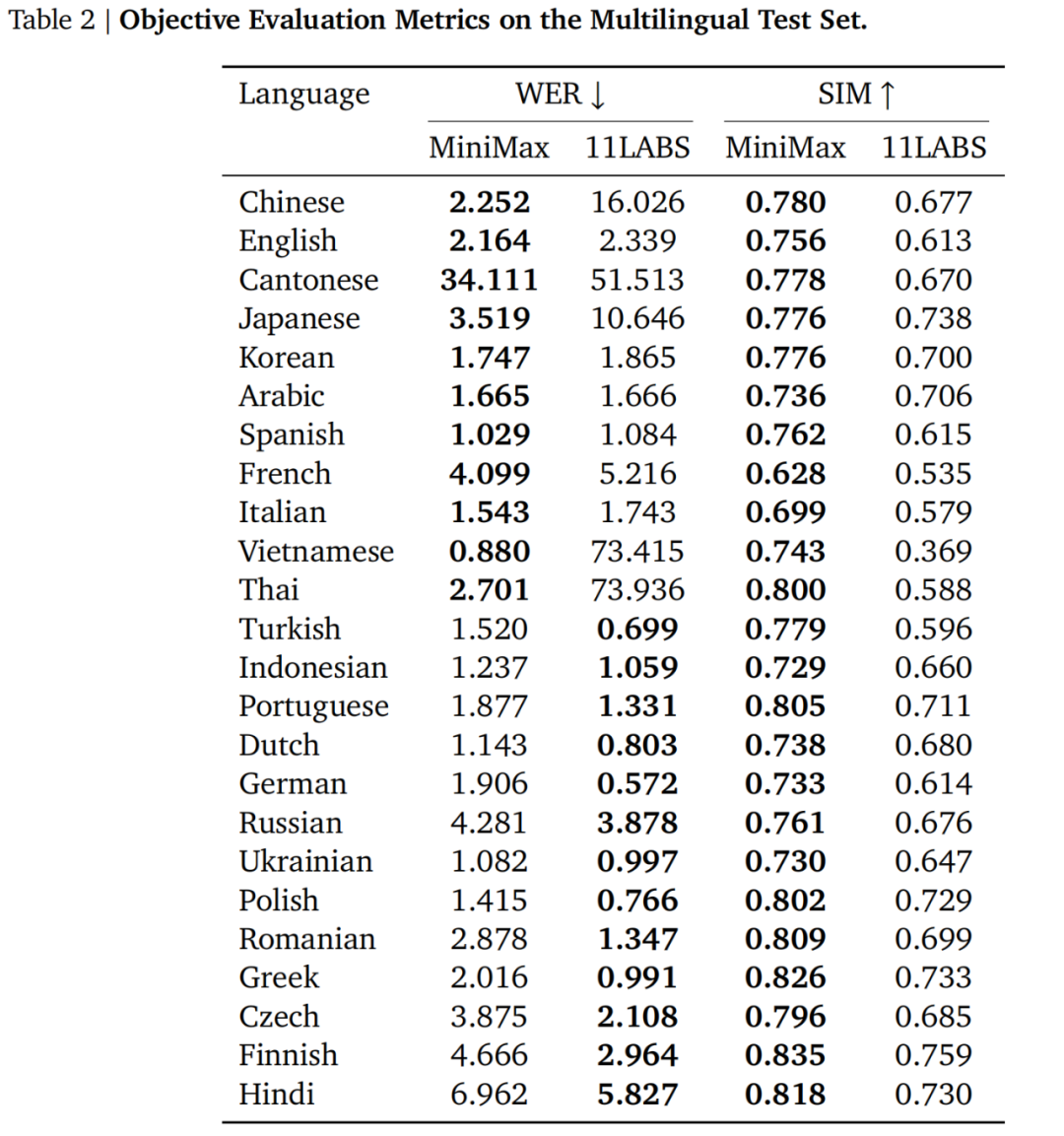 在多语言方面,Speech-02着重与ElevenLabs的multilingual_v2模型进行对比,两者均采用零样本克隆来生成语音。