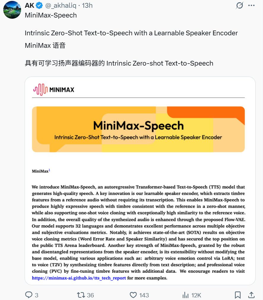 知名博主 AK 也转推了这个新语音模型: