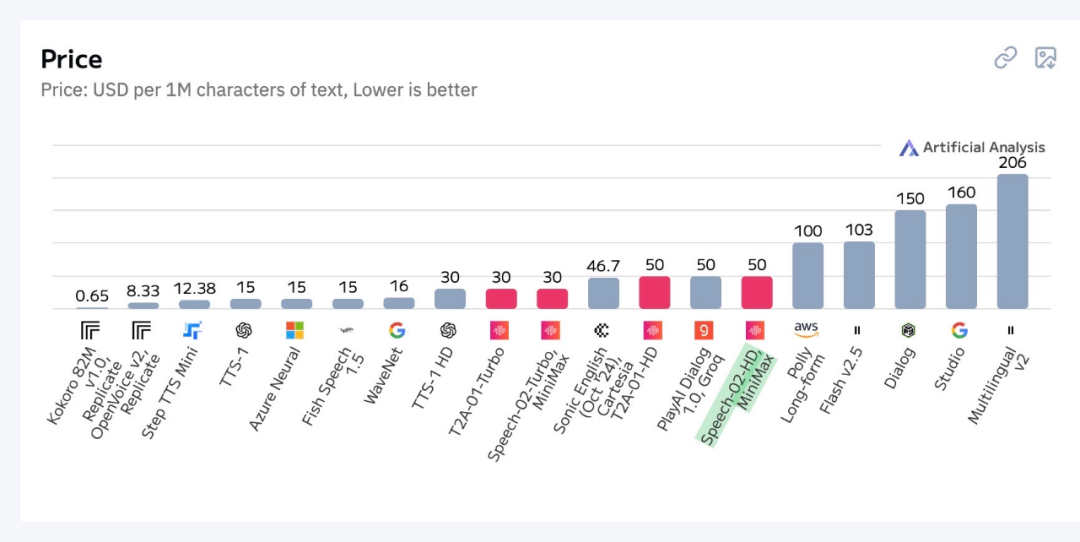 性能更强之外,Speech-02 还极具性价比,成本仅为 ElevenLabs 竞品模型(multilingual_v2)的 1/4。