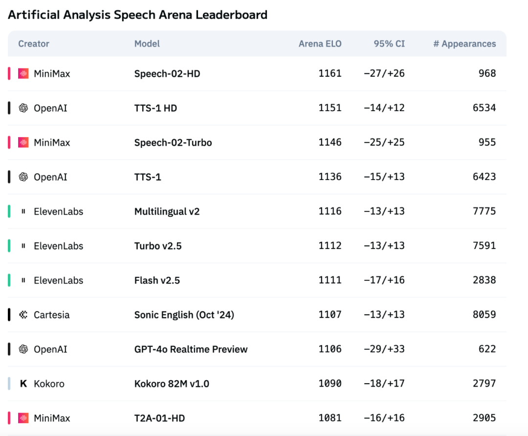 图源:Artificial Analysis Speech Arena Leaderboard