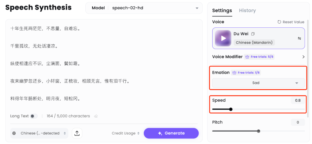 接着上传了苏轼的名篇《江城子・乙卯正月二十日夜记梦》,这是一首他写给已故妻子的悼亡词。由于 Speech-02 可以对音色进一步进行情绪控制,这里选择了悲伤「sad」,并调慢了语速。