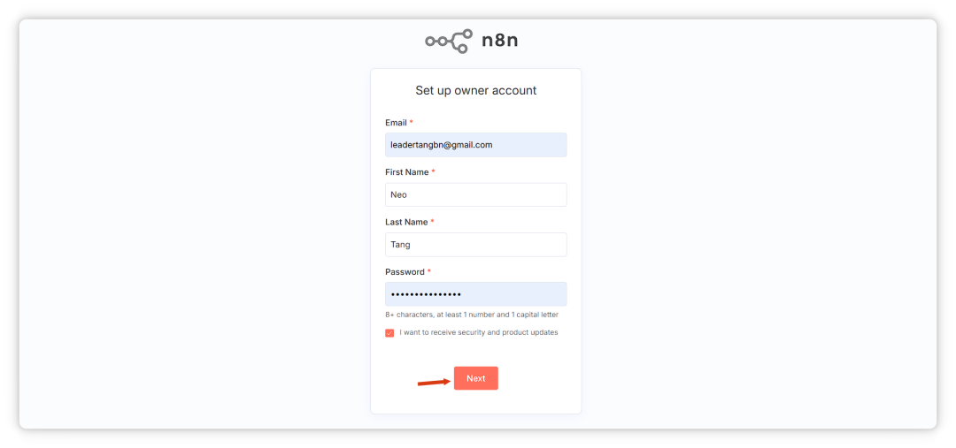 填写邮箱、姓名和密码,点击 Next。