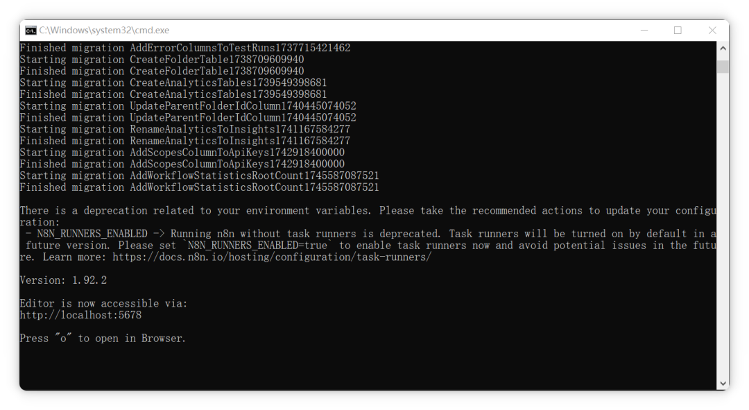npx n8n首次执行可能较慢,因为需要下载依赖。如遇失败,可多尝试几次,或切换至更快的网络环境。
