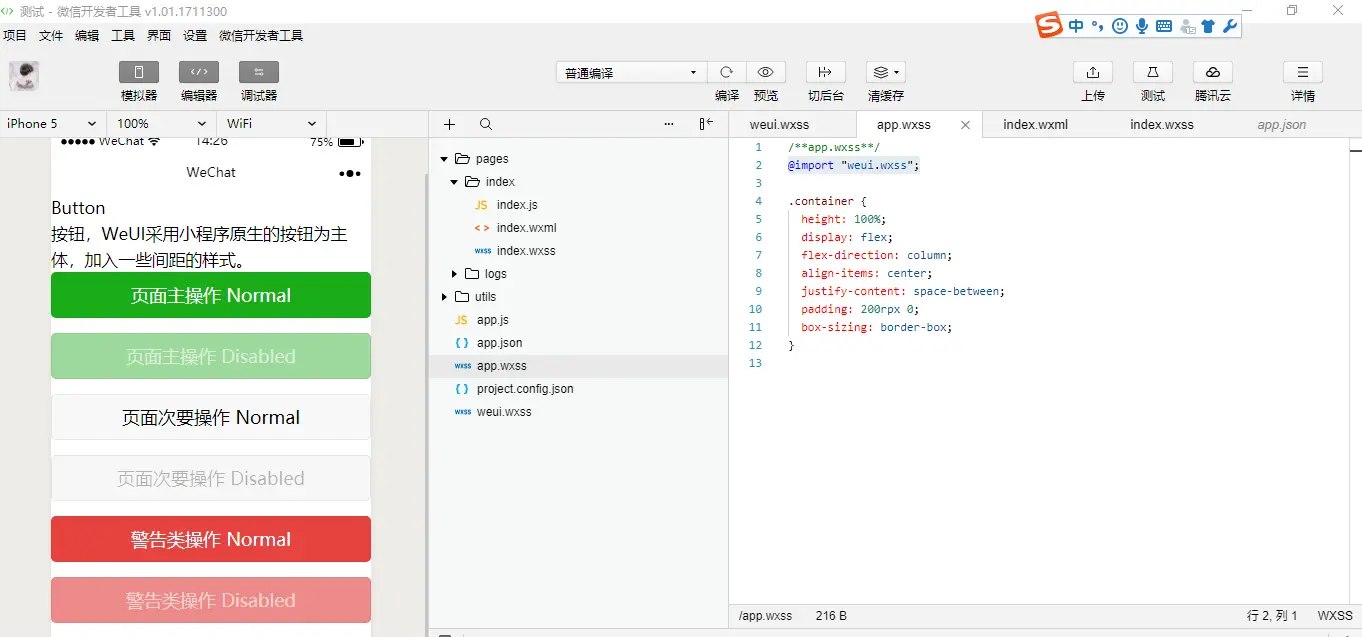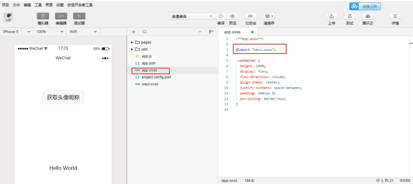 4、在项目中引用:在全局app.wxss中加入weui.wxss的引用- @import "weui.wxss";