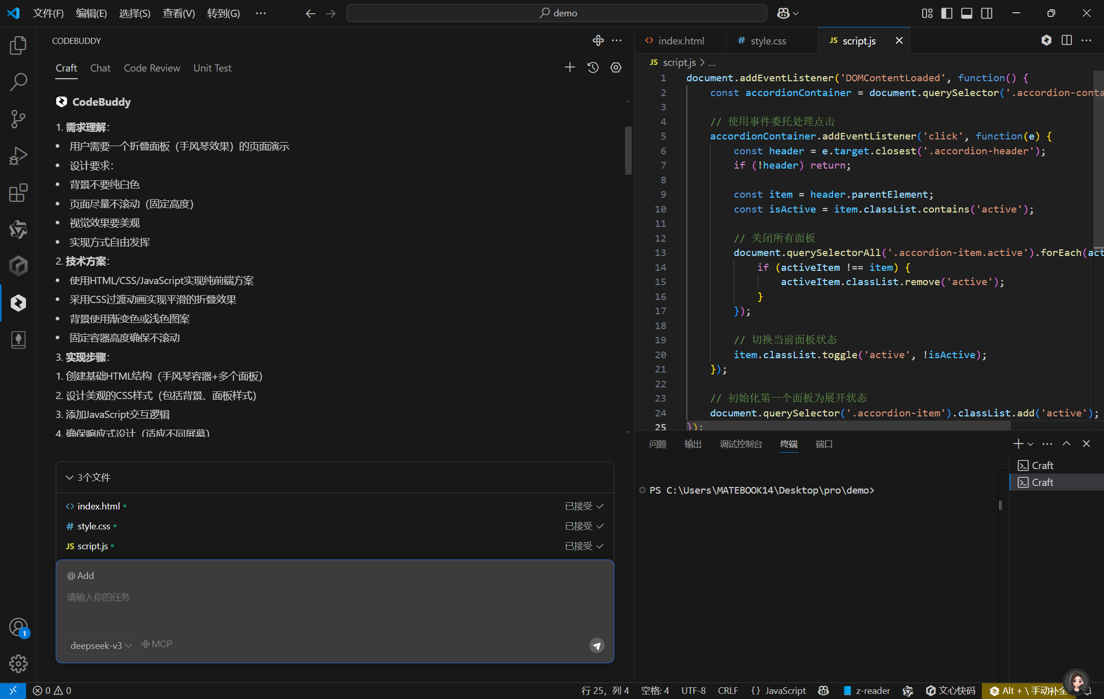 CodeBuddy 能够根据用户输入的需求,自动生成高质量的代码。它可以理解用户的意图,结合相关的编程知识和经验,生成符合要求的代码。在我开发手风琴折叠面板时,它生成的代码结构清晰、逻辑严谨,不仅实现了基本的折叠和展开功能,还添加了平滑的动画效果和良好的用户交互体验。