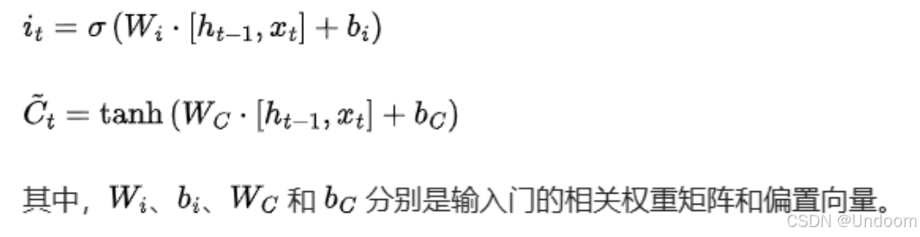 输入门(Input Gate) 输入门负责控制当前输入中有多少信息将被更新到细胞状态中。它同样接收和作为输入,通过 Sigmoid 函数计算出一个更新比例,同时通过一个 Tanh 激活函数对当前输入进行变换,然后将两者相乘得到需要更新到细胞状态中的信息。输入门的计算公式如下: