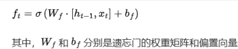 遗忘门(Forget Gate) 遗忘门的作用是决定细胞状态中哪些信息需要被保留,哪些信息需要被丢弃。它接收当前输入和上一时刻的隐藏状态作为输入,通过一个 Sigmoid 激活函数将其映射到 0 到 1 之间的值。其中,接近 0 的值表示对应的细胞状态信息将被遗忘,接近 1 的值表示信息将被保留。遗忘门的计算公式如下: