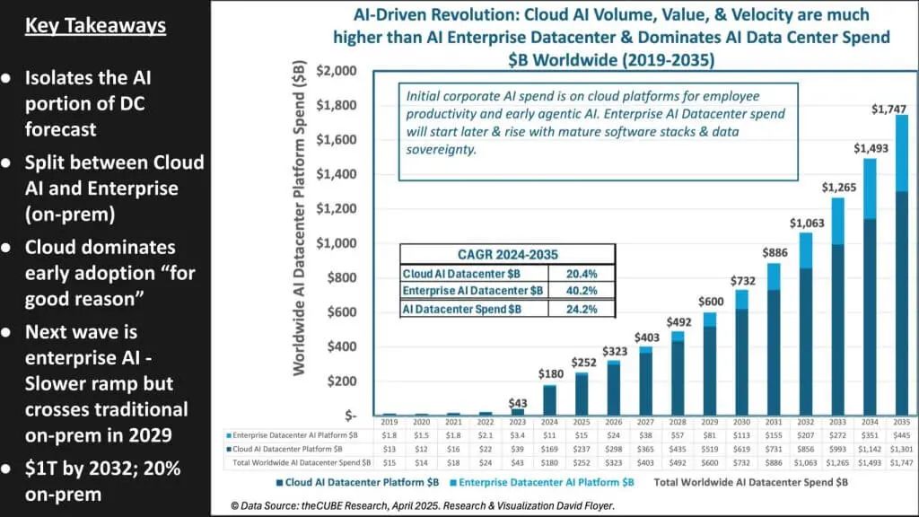 下文图表剔除了非 AI 工作负载,并单独列出了到 2035 年的年度 AI 基础设施支出。两个堆叠区域讲述了这个故事:
