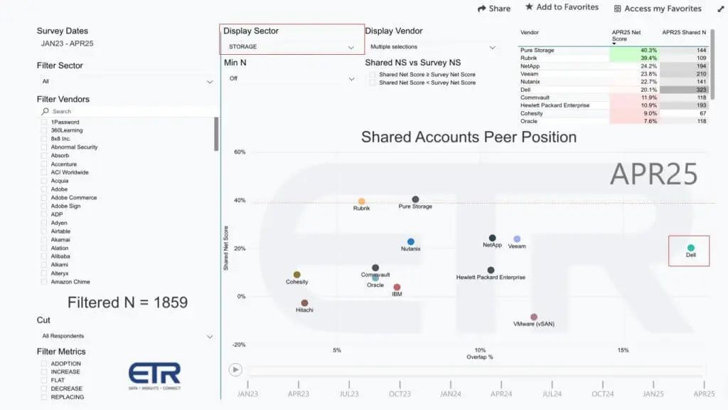 下文图表显示了 ETR 存储散点图,再次绘制了垂直轴上的共享净得分(Shared Net Score)(支出势头)和水平轴上的渗透率(Penetration)(重叠(Overlap))。请记住,ETR 将主存储和数据保护阵列归为一类,因此该领域混合了老牌存储区域网络供应商与下一代和传统备份平台。