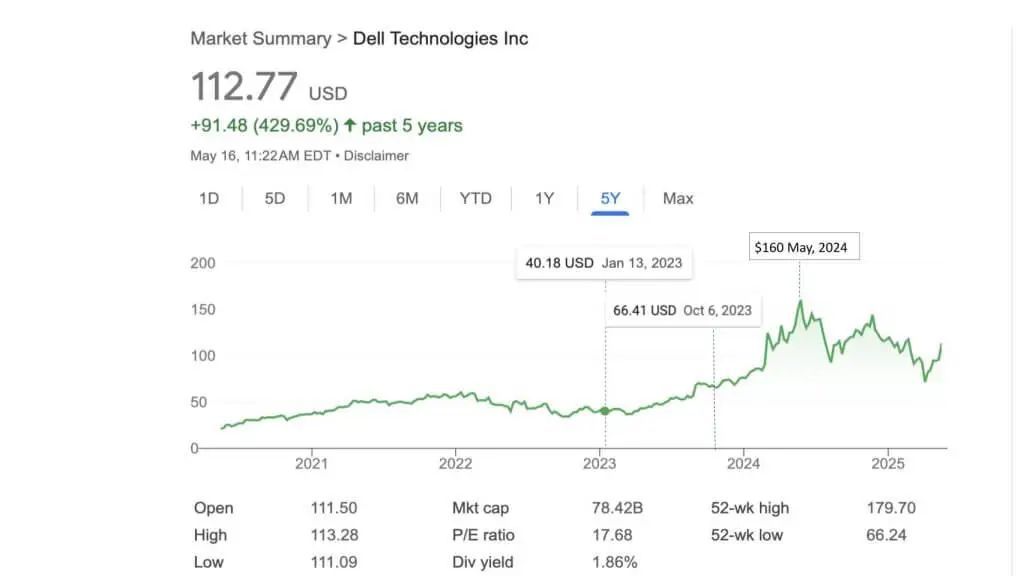 戴尔的股票故事与市场对生成式 AI 的觉醒同步。下文所示的五年股票图表突出了 2023 年 1 月,当时股价约为 40 美元——估值远低于销售额的一倍。