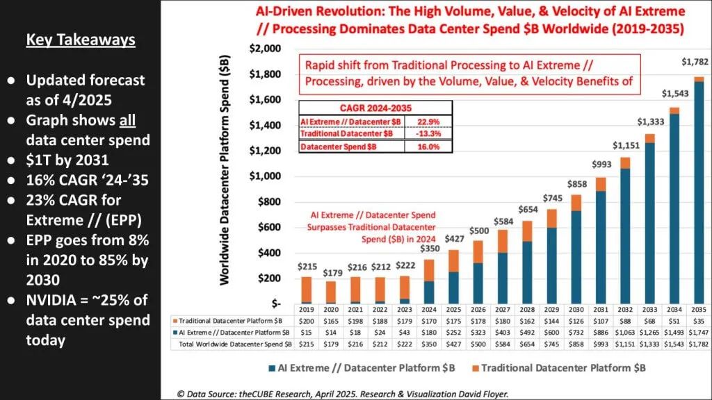 在我们看来,结论是显而易见的——即,每一美元持平的传统 x86 支出都必须被 GPU 密集型架构取代或超越。掌握 AI 工厂的电力、散热和供应链经济学的供应商将驾驭这万亿美元的浪潮;那些固守纯 CPU 设计的公司则面临萎缩到十年末在预测中几乎不显示的灰色区域的风险。IBM 的 Z 系列将在这场转型中幸存下来,x86 也将继续占有一席之地,但通用架构的主导地位时代已经结束。