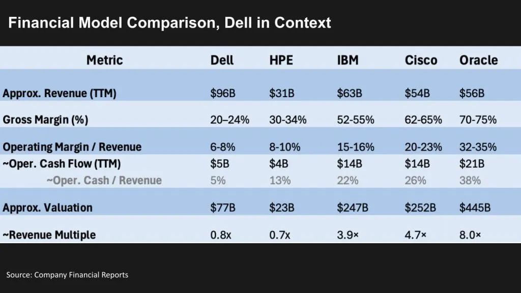 上文展示了五家科技巨头——戴尔、HPE、IBM 公司(IBM Corp.)、思科系统公司(Cisco Systems Inc.)和甲骨文公司(Oracle Corp.)——的比较表格,从左到右排列,以戴尔开头,然后按营收倍数递增。各行分别列出了过去 12 个月的营收、毛利率、营业利润率、营业现金流(美元)、营业现金流占营收的百分比、截至昨天的近似市值以及由此产生的营收倍数。