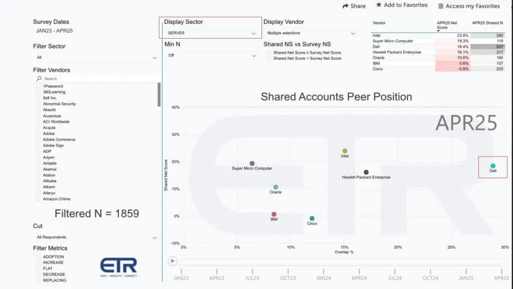 下文图表使用了相同的 ETR 数据集,但将 Y 轴从净得分(Net Score) 切换为普及率(Pervasion)——即调查受访者中将戴尔列为该类别当前供应商的百分比。红色方框突出显示了该指标,柱状图立即显示了戴尔在企业领域(云计算除外)的深度渗透程度。