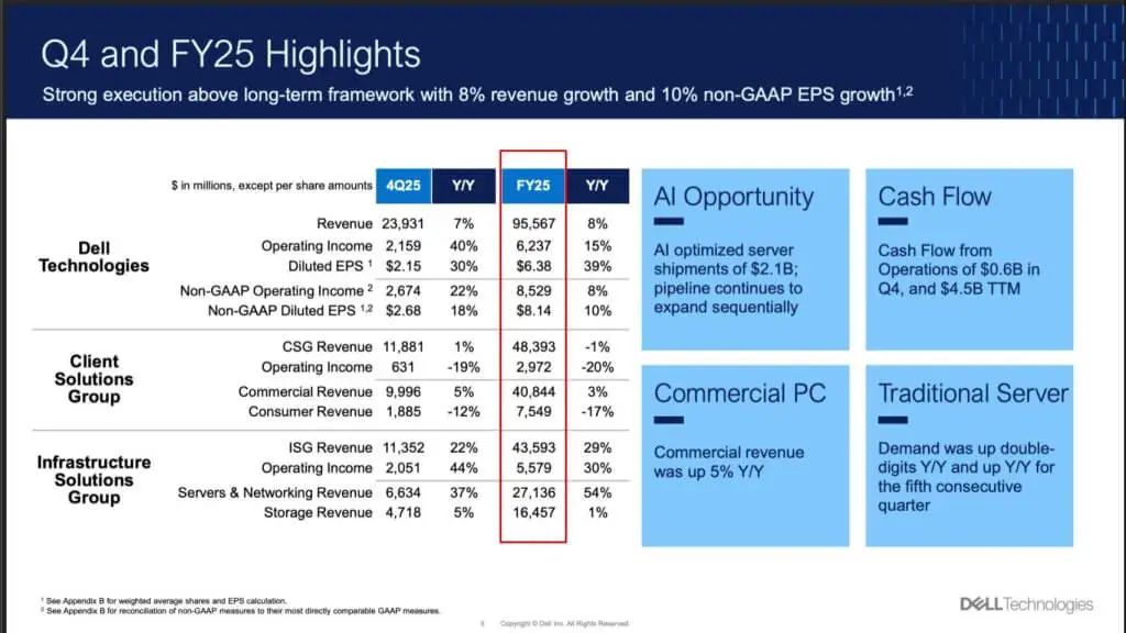 下文来自戴尔财务报告的图表将其损益表提炼为两个主要向量,构成了其 2025 财年近 1000 亿美元总收入的大部分。业务几乎平均分配在其两个报告部门之间。