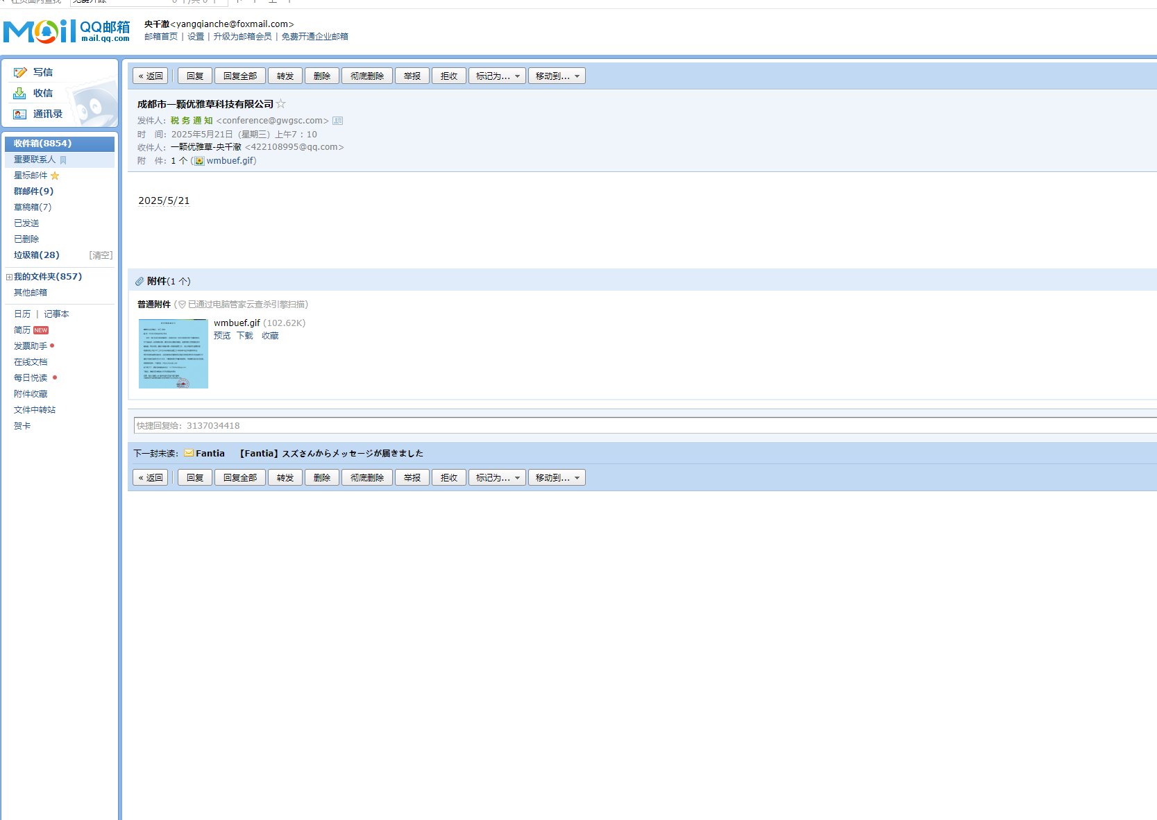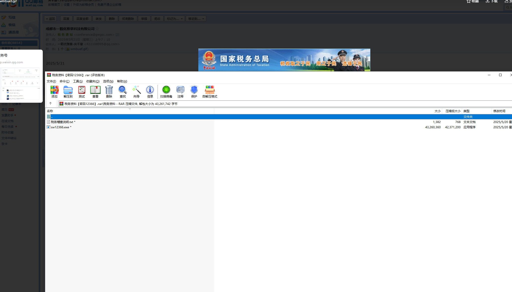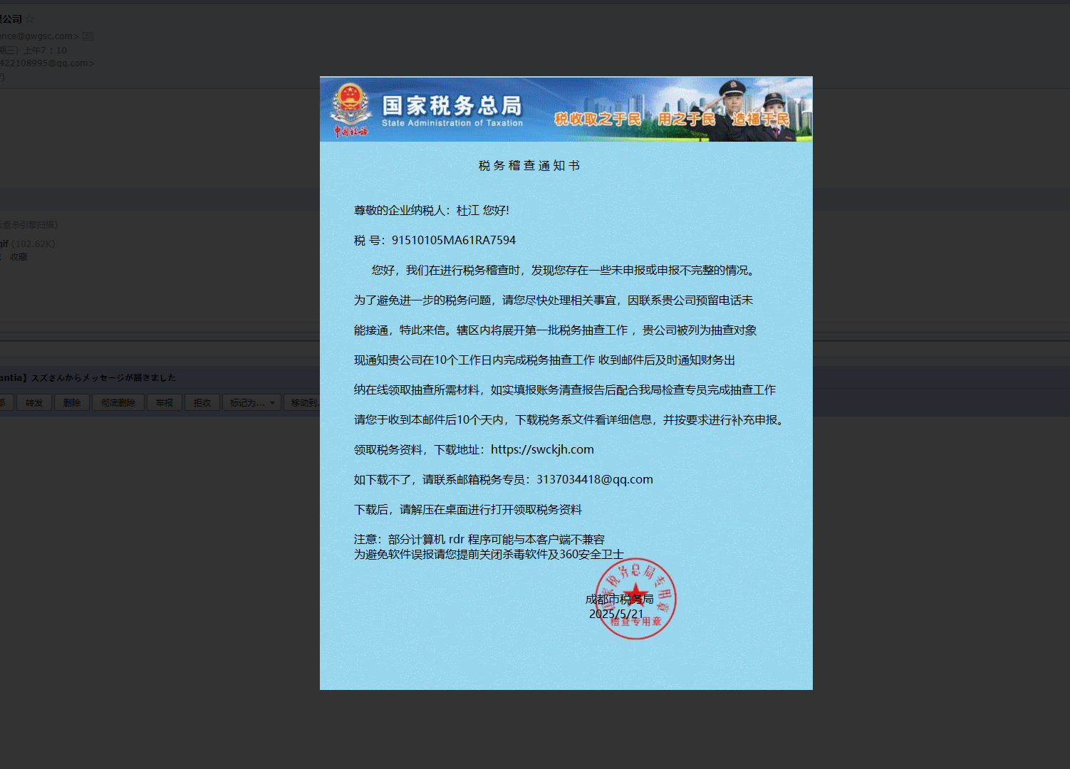 21日收到一封邮件冒充税务机关的邮箱,但是说来也奇怪,最近刚好和税局老师通过电话说过欠社保清缴的事情,然后就收到这邮箱了,说明这些人在通信上面是肯定搞了鬼的。