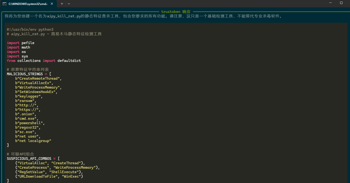 提示词:帮我写一个小型的木马静态特征查杀工具,用于检测windows下的exe可执行文件是否是可疑的木马。我觉得需要一下功能:1. 扫描文件静态字符串,查看是否有明显的恶意特征检查程序熵值是否异常 3. 检查程序动态连接函数,是否存在可疑的导入函数、导出函数的组合扫描PE头及相关分节,确认该程序所使用编程语言、编译链、最低兼容的系统、是否使用已知的加壳技术最后,把这个程序保存为aipy_kill_rat.py文件中,测试该程序,确保没有任何异常。最后,测试我的exe程序:"D:\Tools\aipy20250411\aipy\nimplant.exe"。检测这个文件是不是恶意的木马。把写好的软件保存在项目文件夹下。