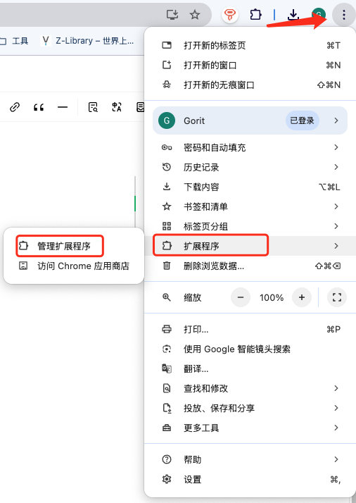 chrome://extensions/ 并按回车键,这将直接带你到Chrome的扩展程序管理界面。 - 或者,点击右上角的三个点(更多操作)> 更多工具 > 扩展程序。