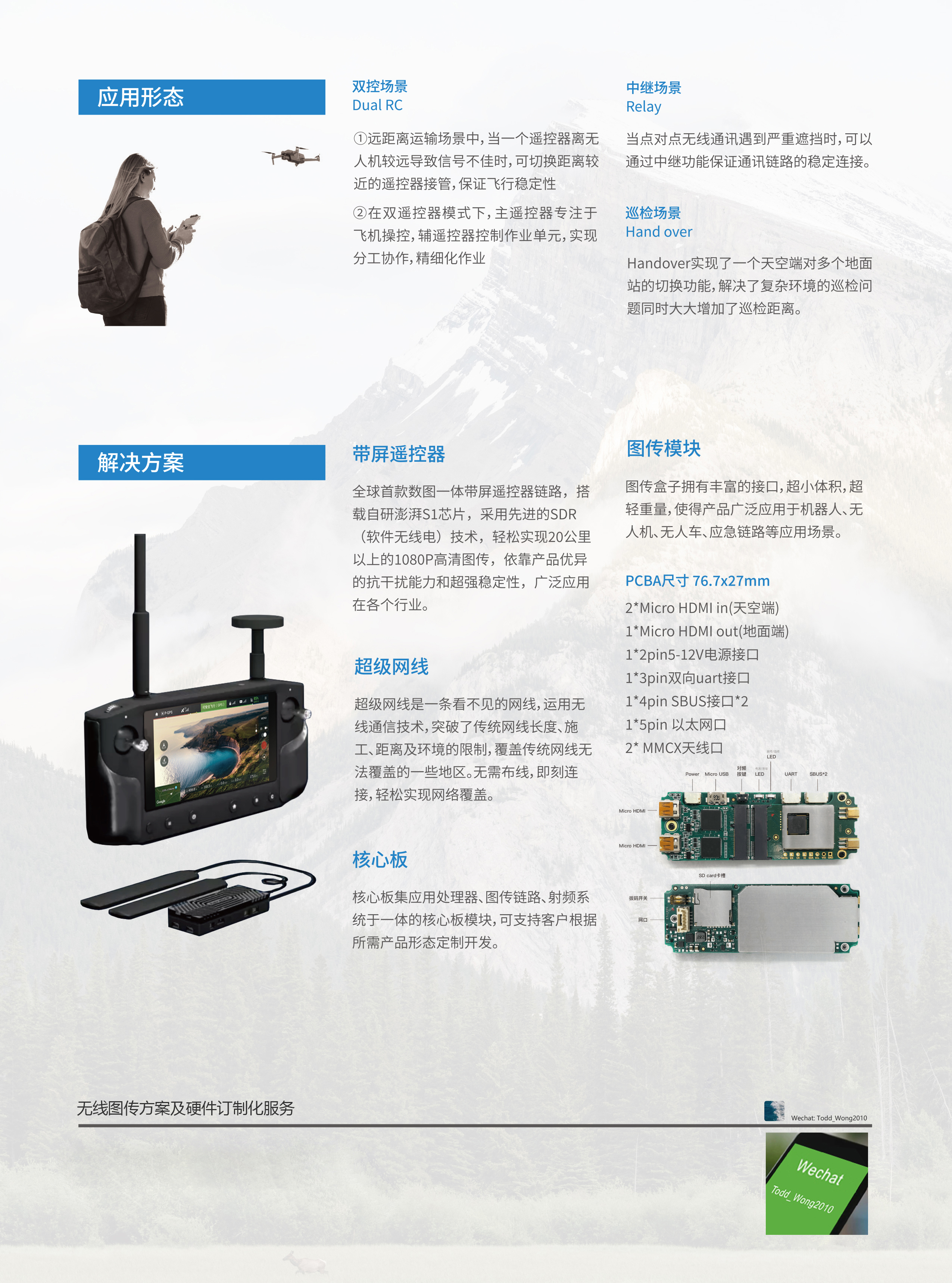此图传技术为数据提供高带宽的无线传输通道,广泛应用于森林防火、智慧乡村、应急布控、管道巡检及无人机控制等领域;