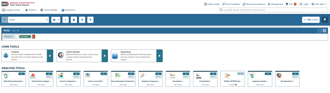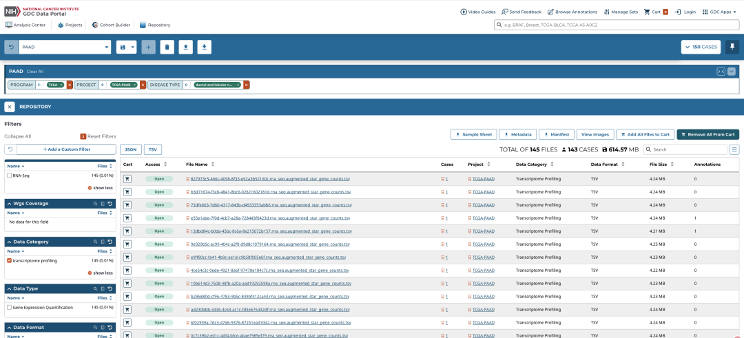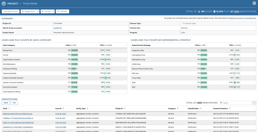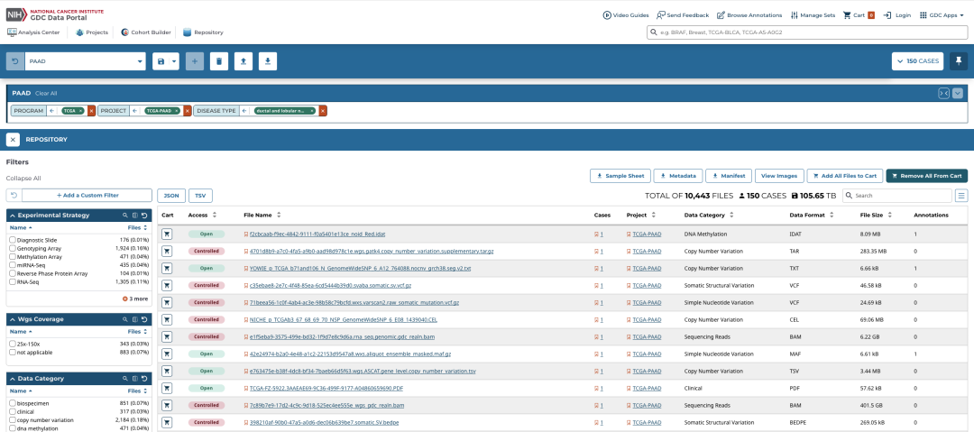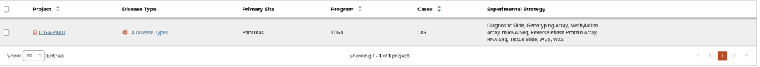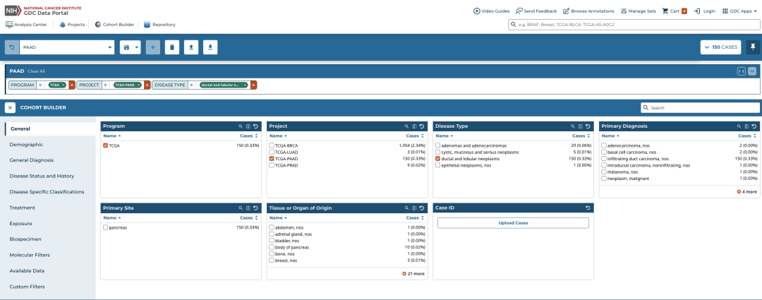 比如我按照以下条件在左侧选择框中进行筛选,想看哪些 TCGA 项目有胰腺导管癌。