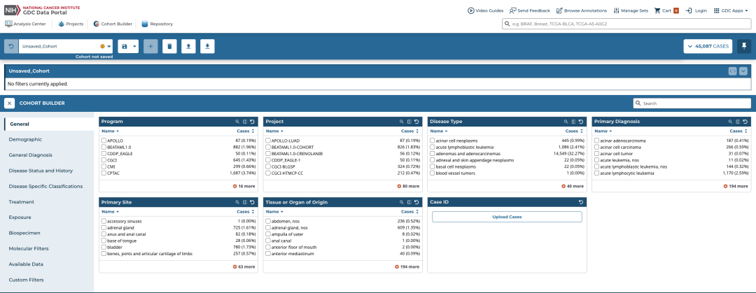 数据库主要有三个界面,Projedcts, Cohort Builder, Repository.