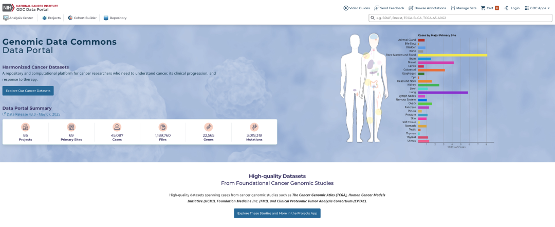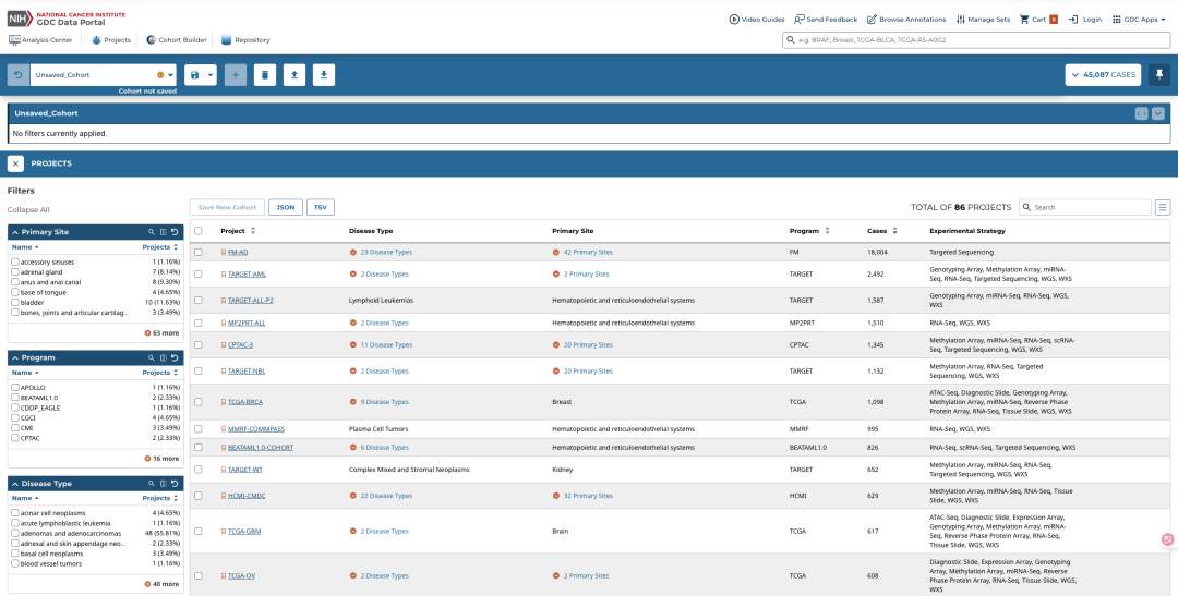 TGCA 数据储存在 Genomic Data Commons Data Portal,但是这个网页不只储存 TGCA 的数据,还保存着其他项目。,目前一共有 86 个 projects。
