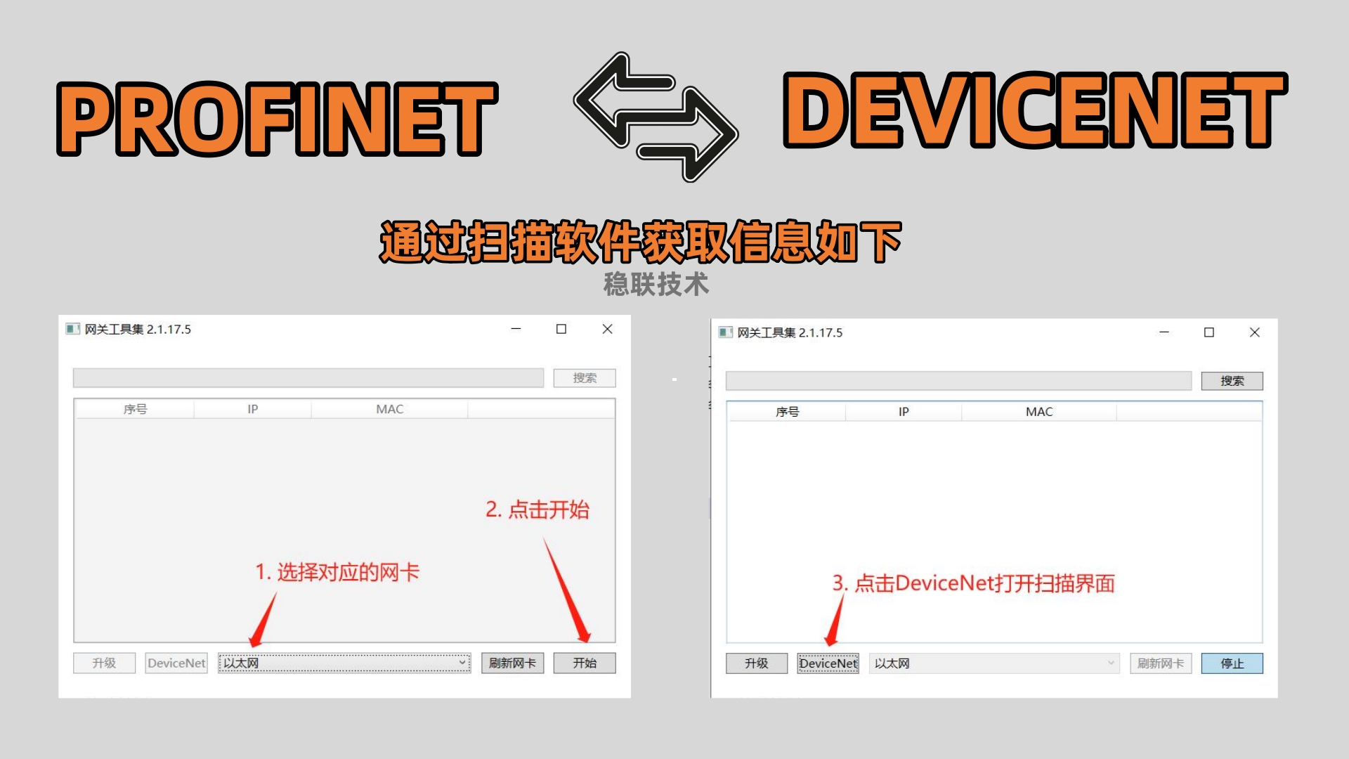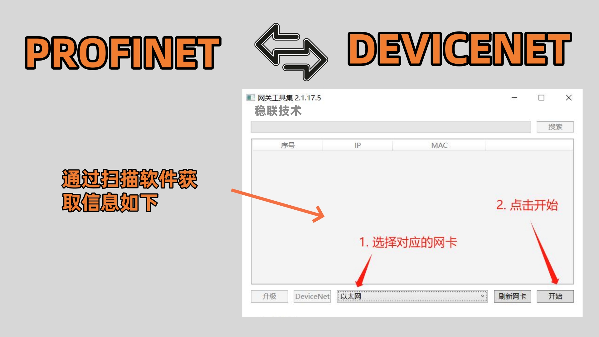 3. 通过扫描软件获取信息如下:(注意:需要先下载一个空的配置,用于指定 DeviceNet 网络的 CAN 波特率)