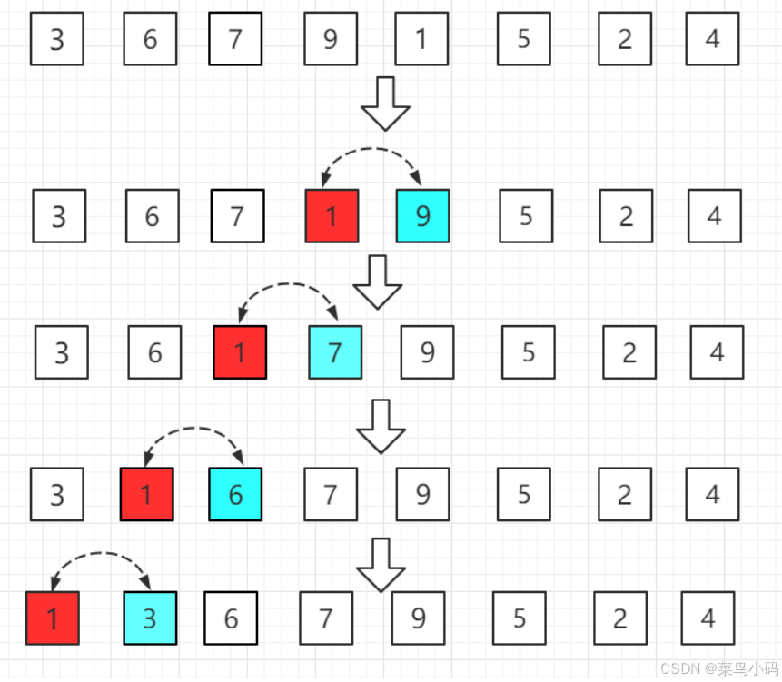 arr[j]。arr[j] 与已排序部分的元素 arr[i] 进行比较,如果 arr[j] 更小,则交换位置,否则继续与前面的元素比较。arr[j] 被正确插入到已排序部分。