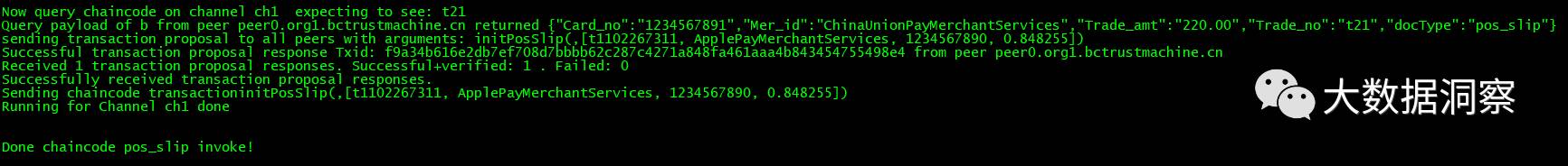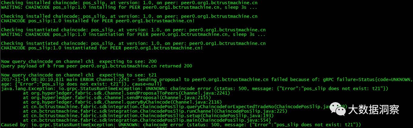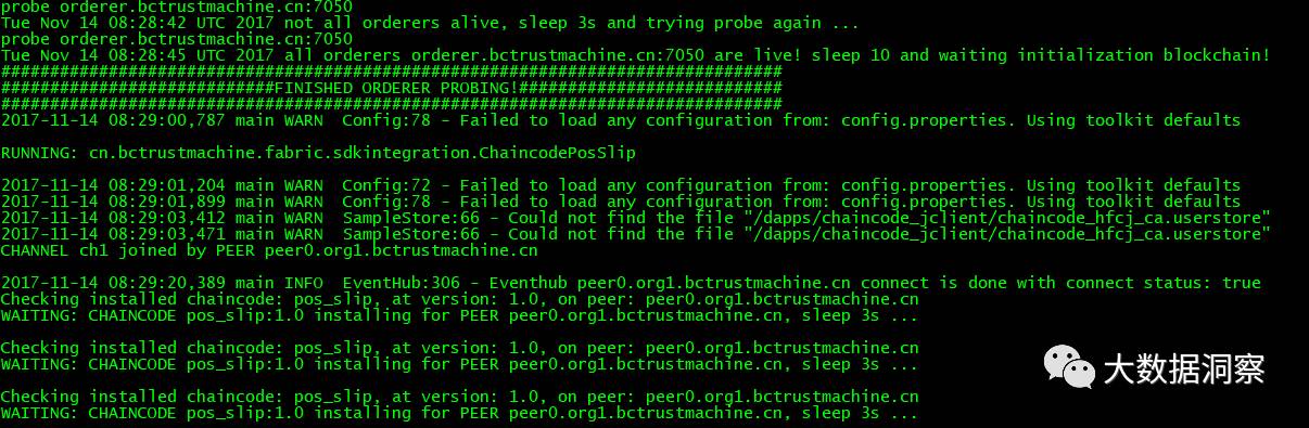 可以看到应用不停进行重试,等待orderer服务可用,channel资源建立,chaincode部署,初始化后才开始执行chaincode的调用,最后调用chaincode成功。