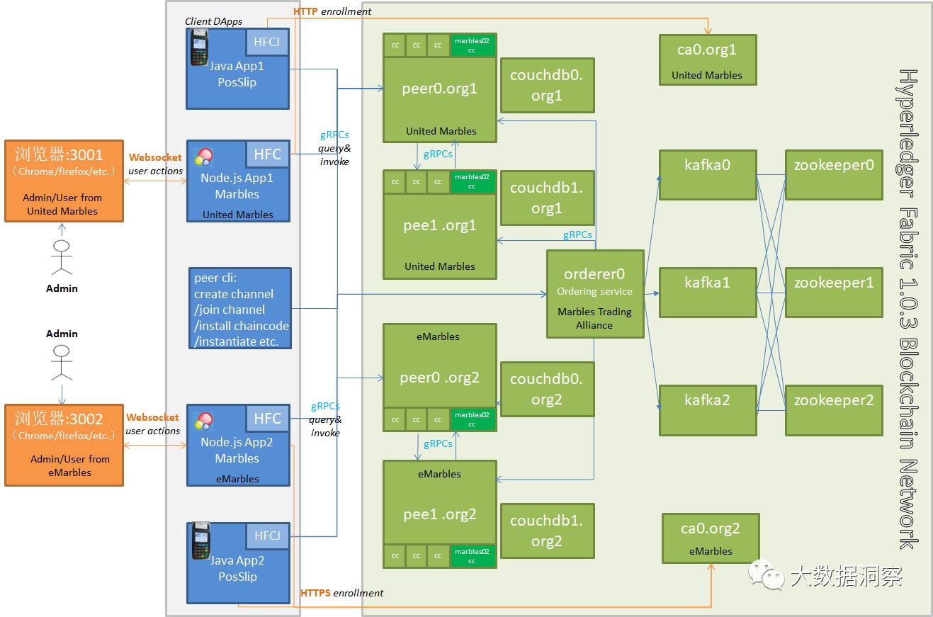 我们的时序器采用kafka消息中间件实现交易的全序排序,采用最少的3个kafka节点进行部署,为简便起见我们只部署了一个时序节点,可以在此基础上扩展部署多个时序节点。存在两种类型的客户端,一种是node.js客户端marbles应用,一种是java客户端posslip应用。存在两个组织org1和org2,org1、org2分别部署两个背书节点,每个背书节点都使用couchdb进行账本的db索引。每个组织都使用自己的ca进行用户的管理,ca为本机构的用户提供证书签名。
