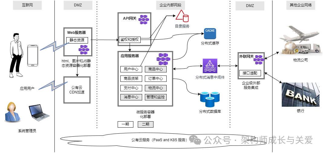 架构概览的重点是采用上帝视角看待系统的架构方案,只要能反映系统整体的架构意图即可,不在于能体现精确性和全面性。架构概览图中需要明确系统的边界,系统包括的主要功能及其部署分布,系统内部各组件间、系统同外部系统间主要的集成关系,主要基础设施方案决策。