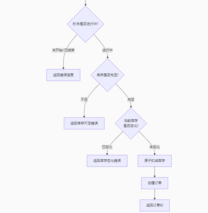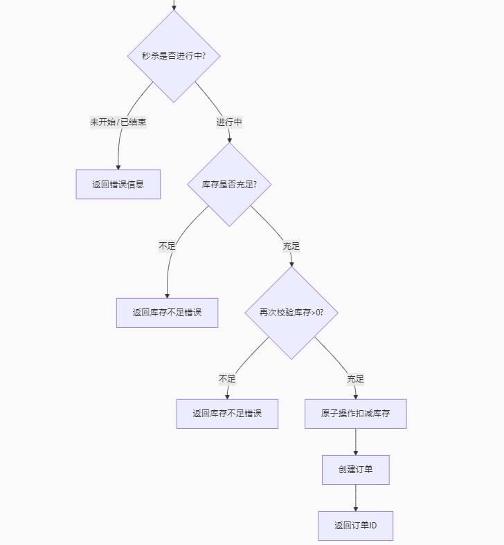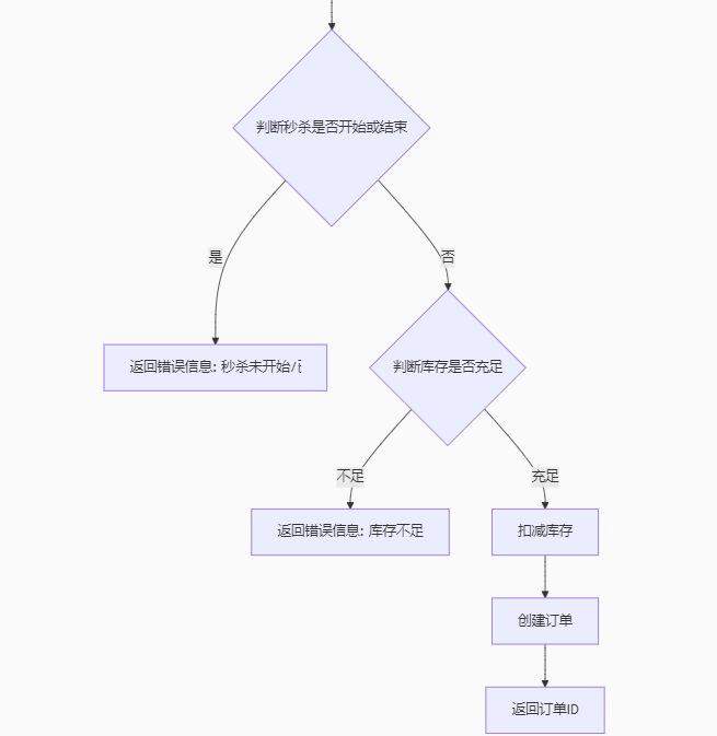 前端提交优惠券id ==》后端接收id ==》根据优惠券id查询数据库,得到优惠券信息 ==》判断秒杀是否开始或结束 ==》秒杀没有开始或已经结束 ==》返回错误信息 ------- ==》秒杀正在进行 ==》判断库存是否充足 ==》不足 ==》返回错误信息 ------- ==》充足 ==》再次判断库存是否大于0 ==》库存不足返回错误信息 ------- ==》库存足 ==》扣减库存 ==》创建订单 ==》返回订单id
