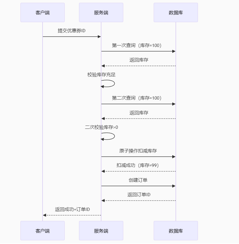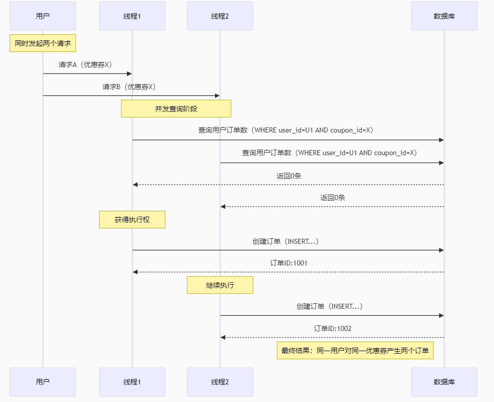 前提:库存充足,并且是同一个用户下单,此时该用户还没有下单(订单数量0) -------- 例子:一个用户同时发出俩个请求(买相同的优惠券),线程1先查询,线程2后查询,线程1判断用户是否下过单,线程2判断用户是否下过单 ==》线程1先执行 ==》线程1查询订单数量(0) ==》线程1判断订单数量 ==》订单数量为0,可以下单 ==》线程2抢到执行权 ==》线程2执行查询订单数量(0) ==》订单数量为0,也可以下单 ==》线程1抢到执行权 ==》由于订单数量为0,线程1执行下单操作 ==》线程2执行 ==》由于订单数量为0,线程2执行下单操作 --------- 那么最终一个用户下了两单,出现了并发安全问题