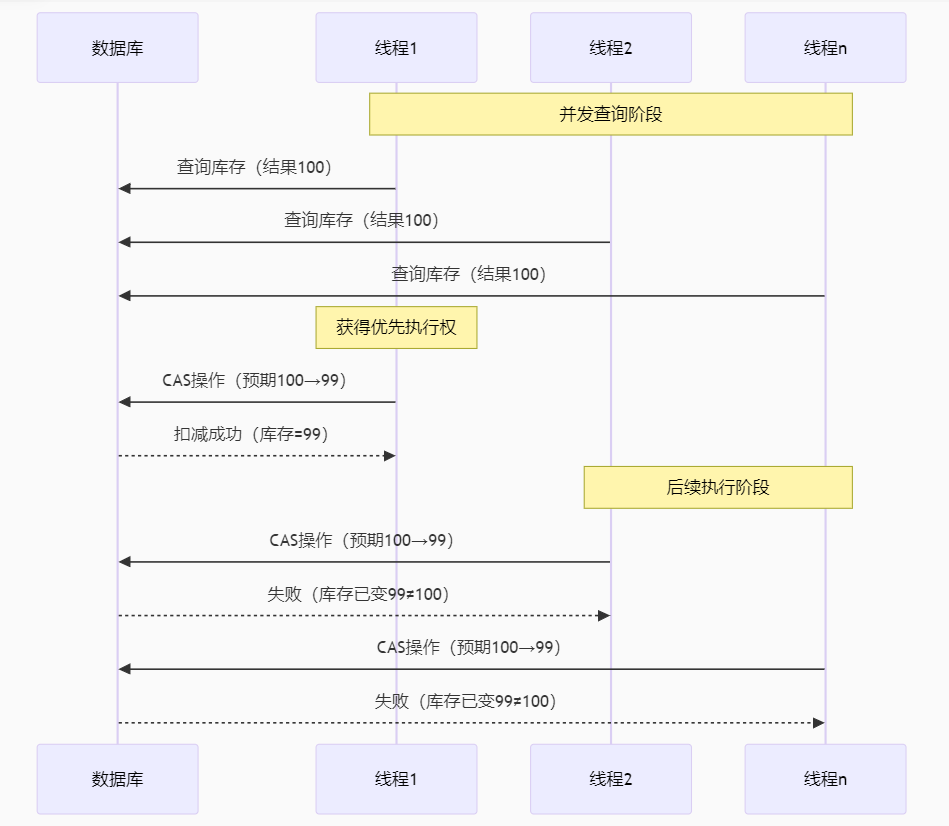 前提:优惠券库存100 例子:100个线程都先进行了查询库存操作,都还没有执行到判断库存是否发生改变 ==》线程1-100查询库存(100) ==》线程1优先于其他线程先执行完判断库存操作(100) ==》线程1扣减库存(99) ==》不管之后是哪个线程来执行判断库存操作 ==》库存已经发生变化,抢券失败 ---------- 那么此时100个用户抢券,只抢券成功一人,但是我的优惠券库存却还有99张,失败率极高