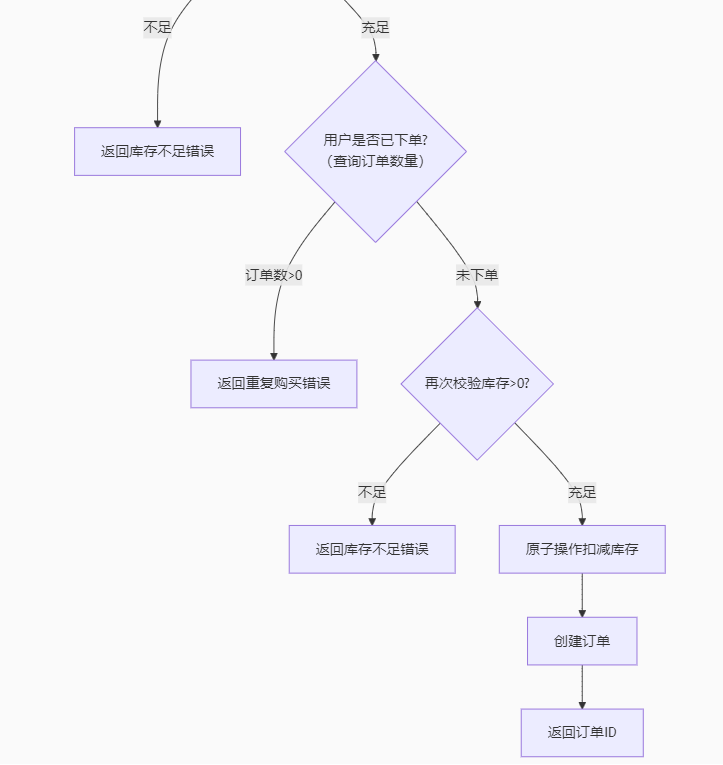 前端提交优惠券id ==》后端接收id ==》根据优惠券id查询数据库,得到优惠券信息 ==》判断秒杀是否开始或结束 ==》秒杀没有开始或已经结束 ==》返回错误信息 ------- ==》秒杀正在进行 ==》判断库存是否充足 ==》不足 ==》返回错误信息 ------- ==》充足 ==》根据优惠券id和用户id来查询数据库,返回查询数量 ==》判断数量是否大于0 ==》大于0,即用户已经下过一单(每张优惠券id不同) ==》返回错误信息 ------- ==》数量小于0,即用户没有下单 ==》再次判断库存是否大于0 ==》库存不足返回错误信息 ------- ==》库存足 ==》扣减库存 ==》创建订单 ==》返回订单id