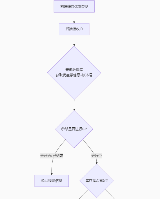 前端提交优惠券id ==》后端接收id ==》根据优惠券id查询数据库,得到优惠券信息,获取版本号 ==》判断秒杀是否开始或结束 ==》秒杀没有开始或已经结束 ==》返回错误信息 ------- ==》秒杀正在进行 ==》判断库存是否充足 ==》不足 ==》返回错误信息 ------- ==》充足 ==》判断版本号是否发生改变 ==》改变返回错误信息 ------- ==》版本号相同 ==》扣减库存 ==》创建订单 ==》返回订单id