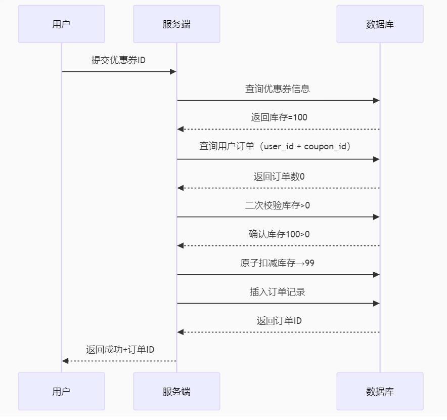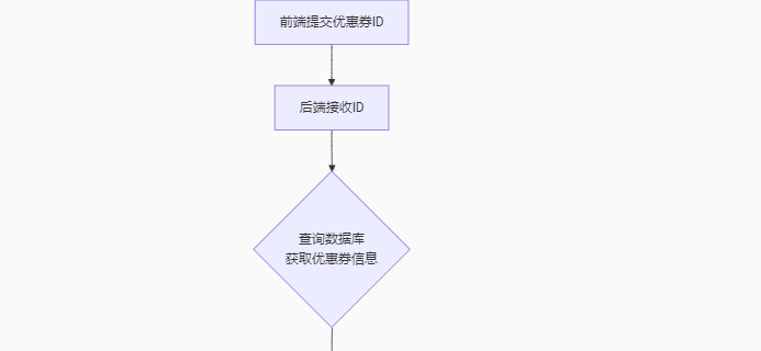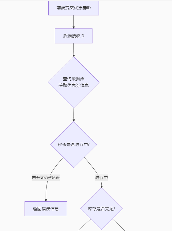 前端提交优惠券id ==》后端接收id ==》根据优惠券id查询数据库,得到优惠券信息 ==》判断秒杀是否开始或结束 ==》秒杀没有开始或已经结束 ==》返回错误信息 ------- ==》秒杀正在进行 ==》判断库存是否充足 ==》不足 ==》返回错误信息 ------- ==》充足 ==》扣减库存 ==》创建订单 ==》返回订单id