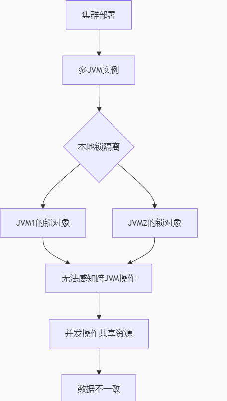 总结:在集群/分布式系统的情况下会有多个jvm存在,由于我们使用的是jvm自带的锁synchronized,而每个jvm都有自己的锁监视器对象,所以每个锁都可以有一个线程来获取,出现并行运行,出现安全问题
