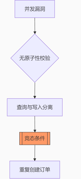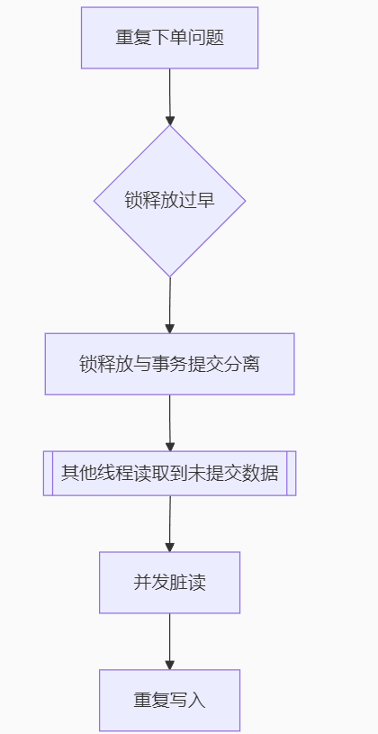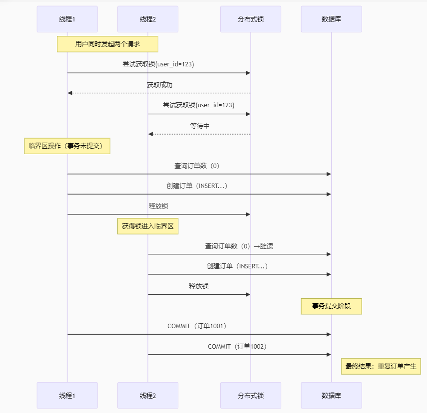 前提:同一个用户发出两个请求,并且此时用户没有下单(订单数0) ==》线程1先执行 ==》线程1查询订单数量(0) ==》线程1获取锁成功,执行锁内代码 ==》线程1释放锁,但是事务还未提交 ==》线程2查询订单数量(0) ==》线程2获取锁成功,执行锁内代码 ==》线程2释放锁 ==》线程1事务提交成功(订单加1) ==》线程2事务提交成功(订单加1) ------ 此时同一个用户下了俩单