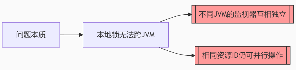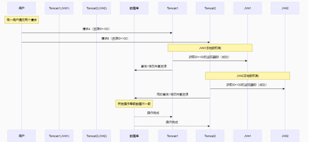 当我们集群时 ==》有一个新的部署 ==》就会有一个新的Tomcat ==》就会有一个新的jvm ==》就会有一个新的监视器对象(不同的jvm有不同的监视器) ==》因此当id相同时,Tomcat不同时,可以重复获取锁 ==》假设有2个jvm ==》2个监视器 ==》2个相同的id锁 ----- 那么还是会出现线程安全问题,依旧是一个用户可以根据Tomcat的多少来下多少单