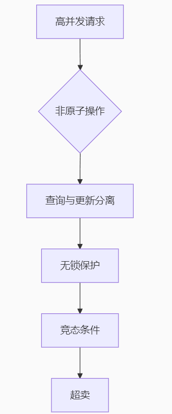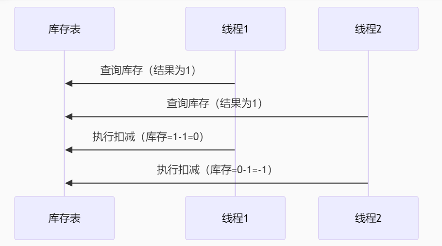 例子:线程1先执行查询库存,线程2再执行查询,线程1扣减库存,线程2扣减库存 ==》线程1先执行 ==》线程1查询库存(1) ==》线程2抢到执行权 ==》线程2查询库存(1) ==》线程1再次抢到执行权 ==》由于库存大于0 ==》线程1执行库存扣减操作 ==》此时库存(0) ==》线程2执行 ==》由于之前查询库存结果为1 ==》线程2也执行库存扣减操作 ==》此时库存(-1) ---------- 那么此时优惠券库存为-1,已经形成了超卖问题