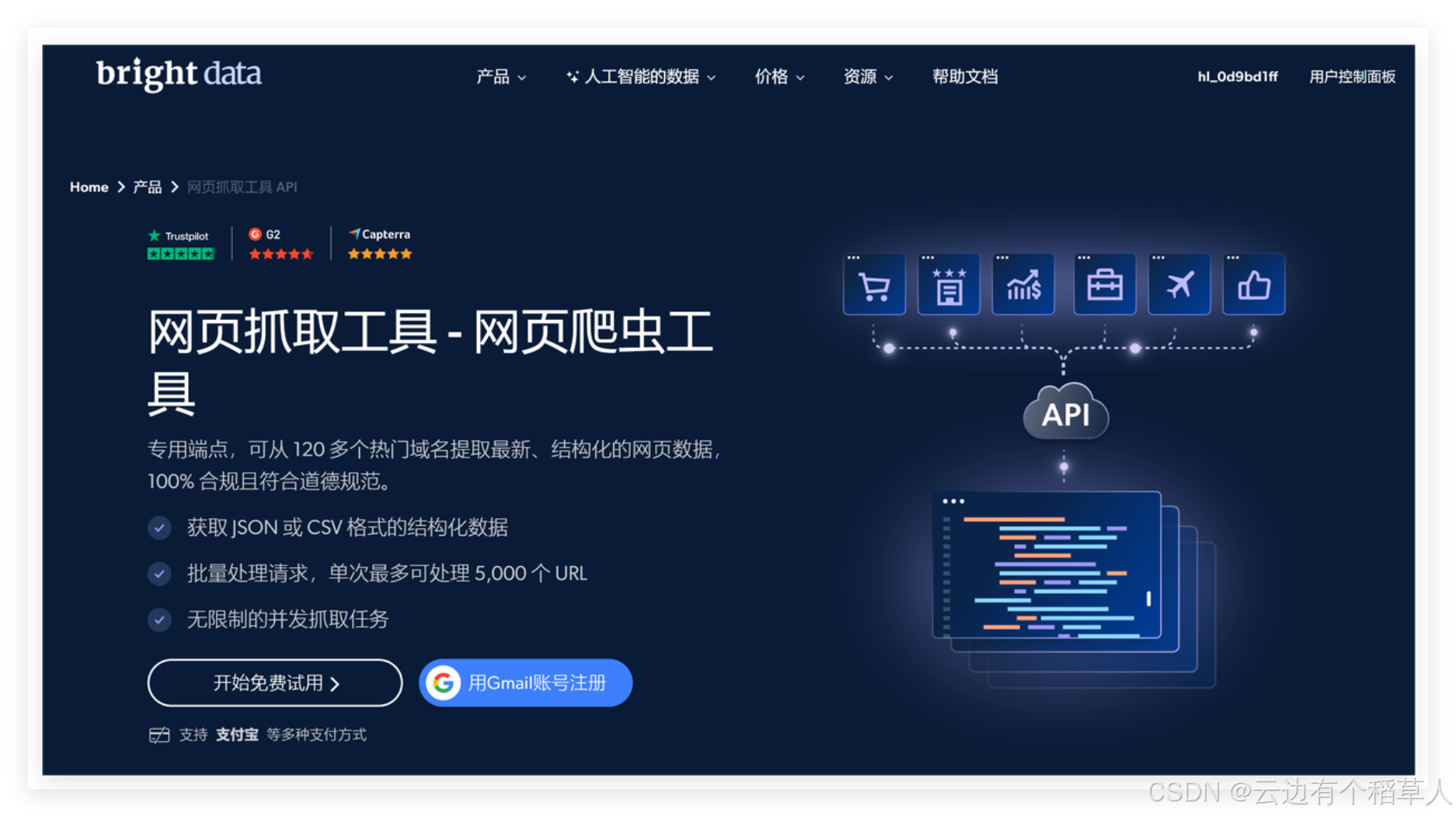 Bright Data的Web Scraper API 是一个基于云的网页抓取API服务,允许用户通过简单的API调用,自动化抓取目标网页中的结构化数据。它集成了代理网络、反爬虫绕过、数据提取与交付功能,使得用户无需自己开发复杂的爬虫程序,也能快速稳定地获得高质量网页数据。