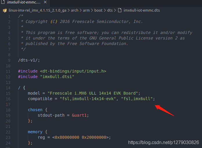 imx6ull-iot-emmc.dts 文件中根节点的 compatible 属性如图: