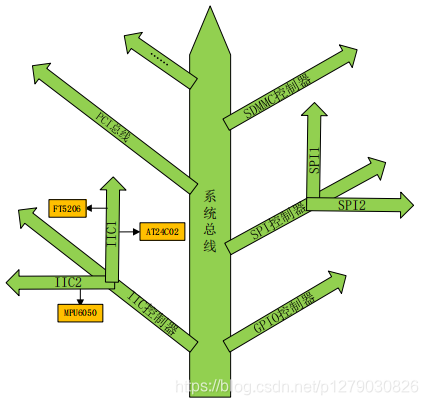 树的主干就是系统总线,IIC 控制器、GPIO 控制器、SPI 控制器等都是接 到系统主线上的分支。IIC 控制器有分为 IIC1 和 IIC2 两种,其中 IIC1 上接了 FT5206 和 AT24C02 这两个 IIC 设备,IIC2 上只接了 MPU6050 这个设备。DTS 文件的主要功能就是按图所示的结构来描述板子上的设备信息。