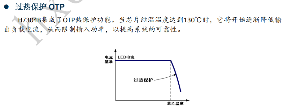 内置过热保护 (TSD): 当芯片结温超过阈值时,自动触发保护机制,降低或关断输出电流,有效防因过热而造成的损坏,系统长期可靠性。