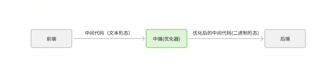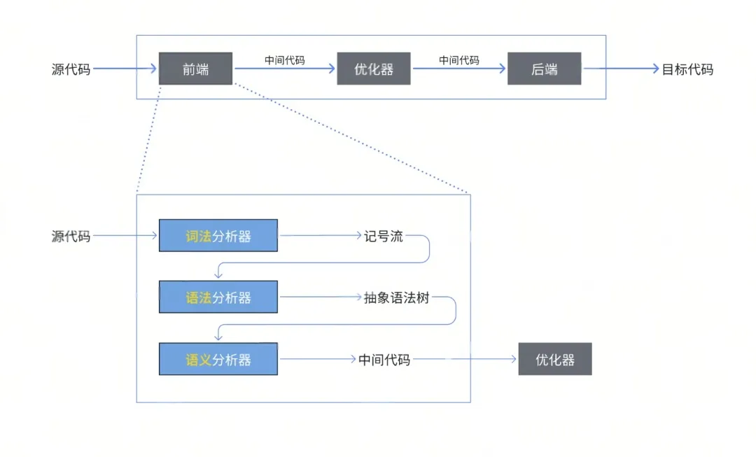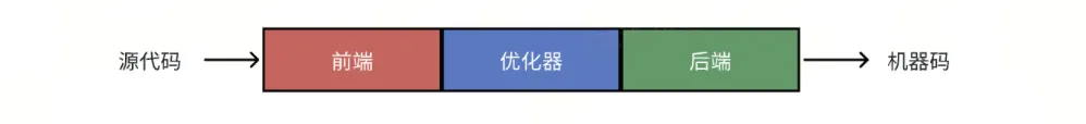 一个完整的编译器通常由三个主要部分组成:前端、优化器和后端。